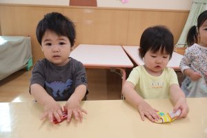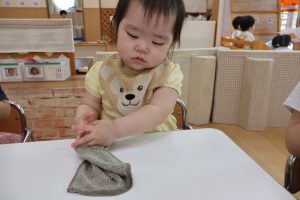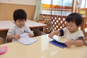 おやつや給食前は自分のおしぼりを畳んでから『いただきます♪』をしています。