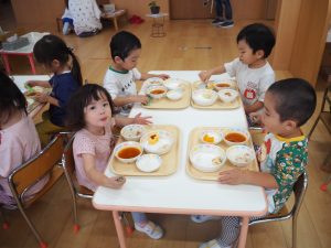 「お友だちと食べると、おいしいね‼」「苦手な食べ物も、ちょっと食べてみようかな?」と、ぱくり!