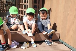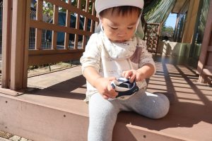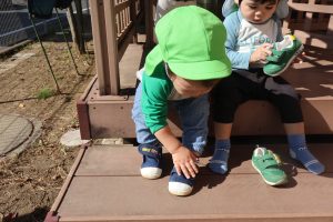 「早く遊びに行こー」と、自分の靴を持ってきて履いてみようとする姿があります。