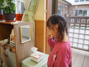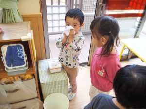 お部屋では鼻水が出ると、自分でティッシュを使って拭いています。