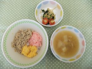 ピンクのそぼろは「お魚からできてるんだよ」と伝えると不思議そうに食べていました。
