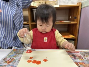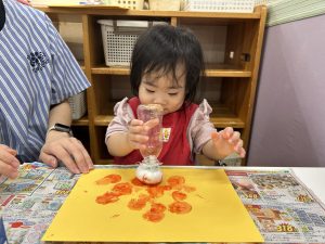 By seioukai2025年10月27日未分類 絵の具のスタンプあそびをしました。 画用紙に丸く色がつく様子やこすれて色がつく様子を楽しみながら リズミカルにトントントン♪と押して楽しみました。 お友だちがスタンプをしている姿に、興味津々の様子で身を乗り出しながら見ていました。