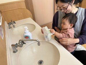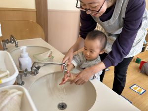 By seioukai2025年11月4日未分類 おやつやごはんを食べる前やお外から戻ってきたら手洗いをしています。 食事の前は自分から洗い場へ向かう姿見られるようになりました。 ごしごし上手だね♪ 手を洗ったら、ペーパーを自分でとって『きれいになったね』と先生と一緒に拭いています。