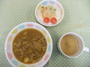 『きのこカレー』には、たっぷりのきのこが入ってました。カレーは子どもたちが大好きなメニューです。