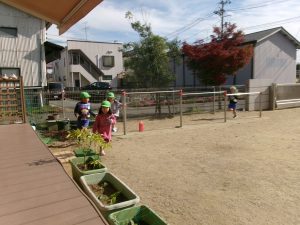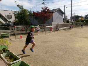 さくら組が挑戦しているマララソンは、園庭を大きく回り、音楽が1曲終わるまで走り続けます。