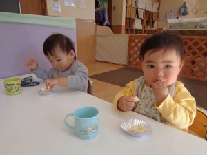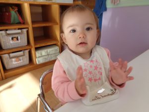 いただきますのあいさつで手を合わせようとしている子どもたちです。
