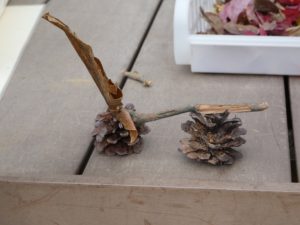 葉っぱやまつぼっくりなどを組み合わせていろんなものも作って遊んでいます。これは、はしご消防車です。