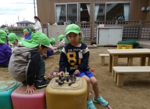 園庭の落ち葉や拾ってきた木の実で遊んでいます。