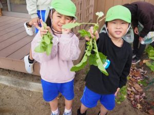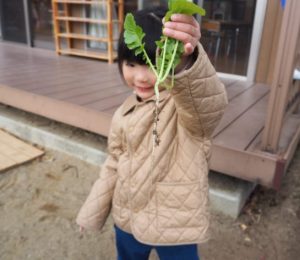 何本か抜いてみると…まだ小さな大根さんでした。「まだ、ちっちゃいねー」と子どもたち。