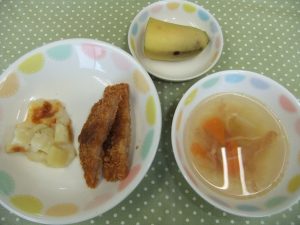 By seioukai2025年11月27日未分類 今日の給食です。 『ハムカツ』は、「サクサクカリカリしておいしいね♪」と喜んで食べていました。おかわりも進みました。 おやつの『セサミトースト』は、甘いゴマペーストがたっぷりついておいしかったです。