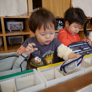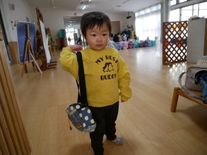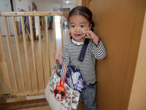 お休み明けも荷物を自分でしっかりと持ち、元気よく登園してきている、りす組のお友だち。