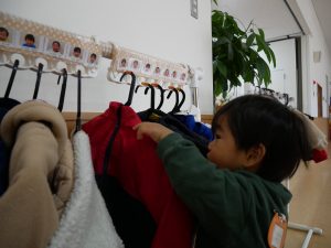 登園後はジャンパーを自分でかけたり、カバンの中からエプロンやおしぼりを出したりする姿も見られています。