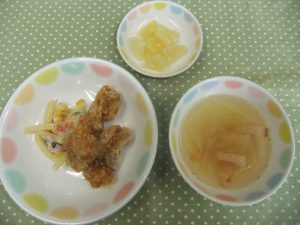 『から揚げ』は、子どもたちに大人気です。おかわりをする子も多く喜んで食べていました。