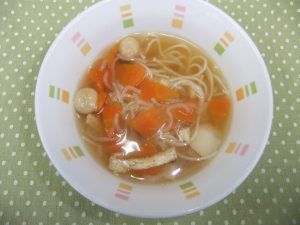 今日のおやつは、白石市統一メニューの『あんかけ温麺』でした。トロっとしたあんかけに沢山の野菜も入っていておいしくいただきました。