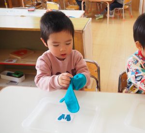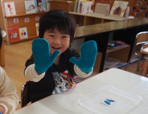 By seioukai2025年12月9日未分類 『てぶくろ』はお部屋で喜んで遊んでいるおもちゃです。 手にはめる時は、ボタンの目印を持ちながら手を入れています。 自分で手を入れることができると、嬉しそうに見せてくれました。 『てぶくろ』ってあったかいね♪