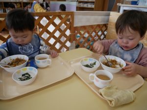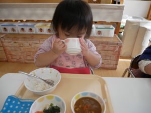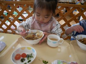 By seioukai2025年12月15日未分類 大好きな給食の時間です。 スプーンを使って自分たちで食べ進める子が増えてきました。 スプーンを下手持ちし、上手に口まで運んでいます。 飲み物を飲むときには両手を添えてゴクゴク。 みんなで食べる給食、おいしいね♪