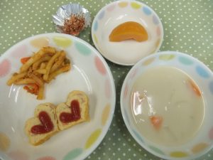 By seioukai2026年1月15日未分類 今日の給食です。 『オムレツ』は、子どもたちに人気です。今日はハート型になっていたので『かわいいね』と喜んでいました。 おやつの『クッキー』は手作りでした。素朴な甘さでおいしかったです。