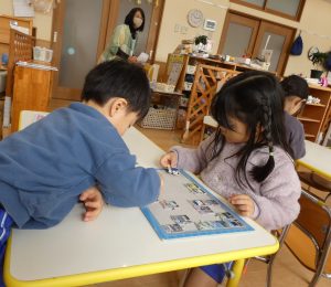 パズルあそびを楽しんでいます。一人でじっくりと取り組む姿が見られました。