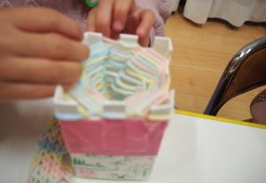 牛乳パックの編み機を使って、交互に毛糸を編んでいきます。