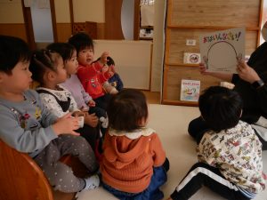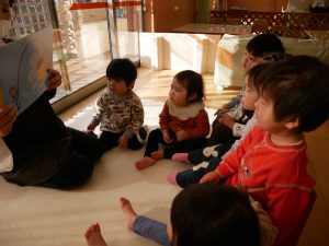 絵本が始まると、コーナーに集まりみんな真剣な表情で見ている姿がありました。