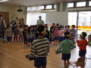 さくら組さんからは、家族も乗っている乗り物や、難しそうな迷路のプレゼントをもらったり、みんなで歌をうたって楽しく過ごしました。