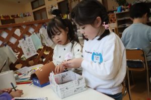 廃材を使っての、製作あそびを楽しんでいます。「この箱をお家にしよう」「お部屋も作ろう!」と