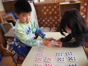 トランプでは、『七ならべ』をしていました。分からない時はお互いに教え合っています。