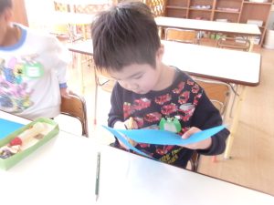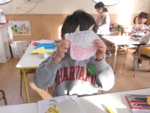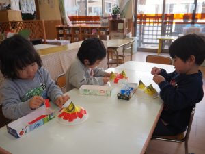 仲良くなるには、「おにさんの仲間になろう!」とお面を作ったり、
