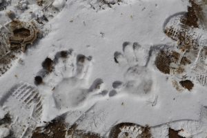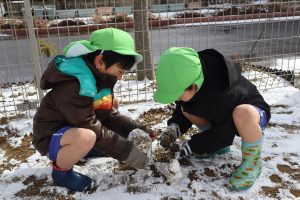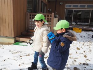 きれいな雪の面を見つけると、両手をつけて手形を楽しむお友だちもいました。