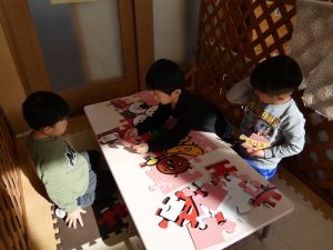 お友だちと一緒に、大きなジグソーパズルをして遊んでいました。