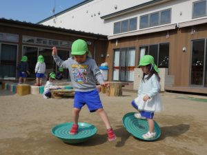 不安定なバランスボードにも挑戦です!落ちないように…と慎重に登ろうとしていました。