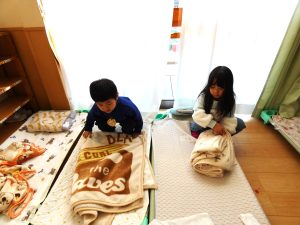 お昼寝から起きた後の布団を自分で畳もうとする姿が見られます。