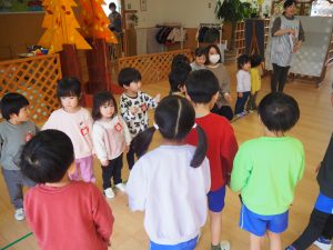 ホールでさくら組さんと一緒に歌あそびをしました。