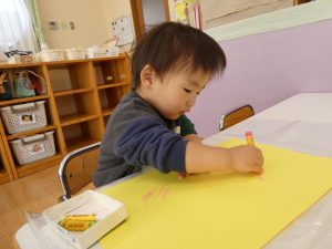 好きな色のクレパスを使い、画用紙に描いて遊びました。手を動かしながら紙に色がつくことを楽しんでいました。