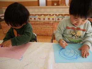 ぐるぐるお絵描きをして遊びました。「『かたつむり』みたいだね!」とお話しながら、円を描いていました。