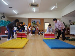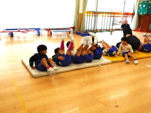 また、3歳児クラスでは前転に取り組みました。