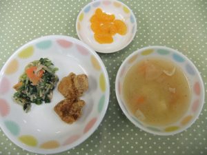 By seioukai2026年2月25日未分類 今日の給食です。 『鶏のからあげ』は喜んで食べる姿があり、お肉をよく噛んで食べていました。 『豚汁』には人参、白菜、大根、ねぎなどの野菜がたっぷり!お肉や里芋も入っていて、体もぽかぽかあたたまりました。