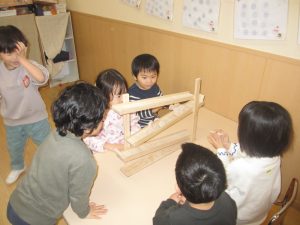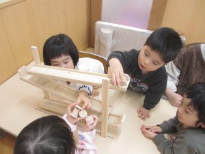 坂道を車が降りていくおもちゃで遊びました。