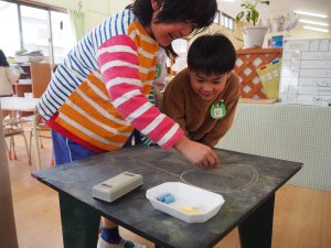 だんだんと友達と一緒に、絵のしりとりを楽しんでいました。