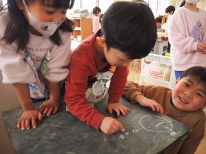 黒板で遊びました。始めは一人一人、好きな絵を描いていたのですが、