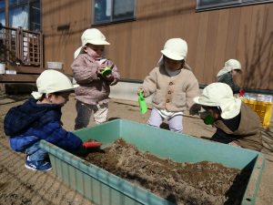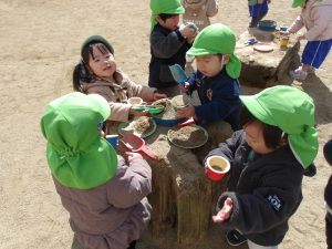 中庭で遊びました。砂場のカップに砂を上手に入れられるようになったり、お友だちに「どーぞ」と