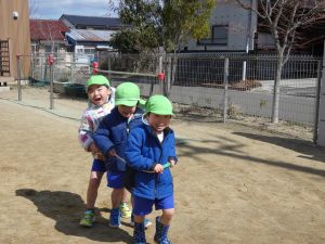 縄を使って『電車ごっこ』が始まりました。「出発しまーす!」