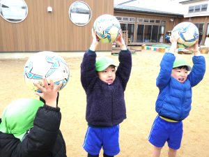 ボールを使っての準備体操や蹴り方を教えてもらいました。