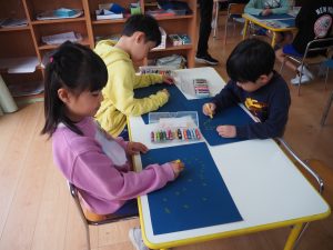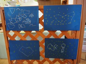 「夜の空に、たくさんお星さまが見えるといいな~」とお星さまを書いて点つなぎを楽しみました。