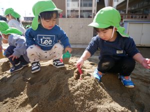 「いっしょに、お山つくる~」と大きな園庭の砂場で一緒に遊ぶ姿が見られました。